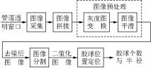 本文軟件模塊的任務(wù)就是從一周期的連續(xù)圖像中自動(dòng)檢測(cè)出所有膠球的數(shù)量及磨損程度。其軟件檢測(cè)框圖如圖3所示。先通過工業(yè)攝像機(jī)采集膠球連續(xù)圖像,并根據(jù)時(shí)間順序存儲(chǔ),然后利用圖像拼接算法去除每?jī)煞B續(xù)圖像之間的重復(fù)部分,再進(jìn)行灰度變換、圖像平滑等一系列預(yù)處理過程去噪,去噪后采用基于小誤差分割法的灰度圖二值化變換對(duì)圖像進(jìn)行分割,得到目標(biāo)明確的分割圖像,后,在此基礎(chǔ)上,進(jìn)行膠球位置定位,獲得膠球的數(shù)量及磨損狀況。