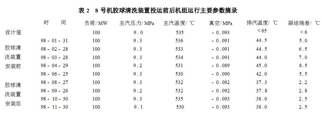 為了分析凝汽器加裝膠球清洗裝置的經(jīng)濟(jì)性,以8號機(jī)為例,其凝汽器加裝膠球清洗裝置前后的有關(guān)參數(shù),見表2。從表中可以看出:膠球清洗裝置投運(yùn)后,8號機(jī)真空有了較大提高,從-0.091MPa提高到-0.093MPa,提升率達(dá)到2.2%,熱耗率及煤耗率均有不同程度下降,經(jīng)濟(jì)效益明顯,一年產(chǎn)生的經(jīng)濟(jì)效益可達(dá)80萬元。而購買兩套膠球清洗裝置(1臺機(jī)2套)及安裝費(fèi)用約20萬元,投運(yùn)后3個月就可以收回全部投資。另外,膠球清洗裝置的成功投運(yùn)大大減少了凝汽器銅管的沾污程度,凝汽器帶負(fù)荷清理的頻率大大減少,節(jié)約大量的人力、物力,同時也大大提高了機(jī)組的安全可靠性。
