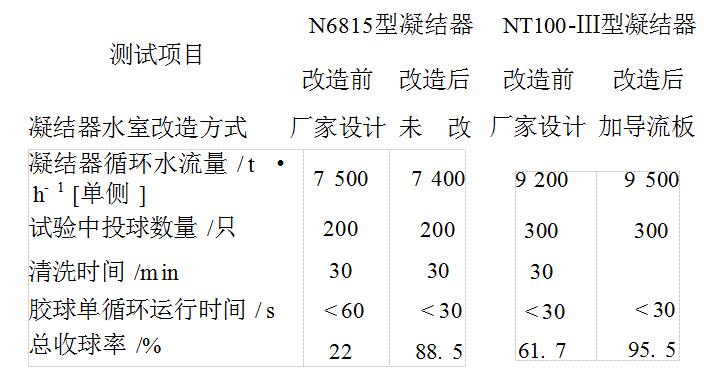 改進(jìn)的某N6815型和NT100-Ⅲ型凝結(jié)器膠球清洗裝置系統(tǒng)在改造前后均作了性能對(duì)比性試驗(yàn),其試驗(yàn)的平均測(cè)試結(jié)果見表1所示。