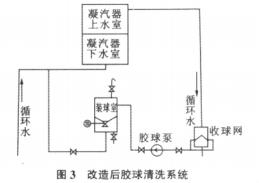 膠球隨循環(huán)水流入循環(huán)水回水管,繼而至收球網(wǎng)并匯集在收球網(wǎng)底部,然后在膠球泵作用下被送進(jìn)裝球室重復(fù)上述運(yùn)動(dòng),達(dá)到清潔凝汽器銅管的目的。