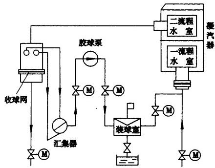 凝汽器膠球清洗裝置系統(tǒng)流程:裝球室→凝汽器銅管→收球網(wǎng)→膠球匯集器→膠球泵→裝球室。