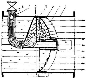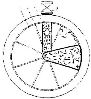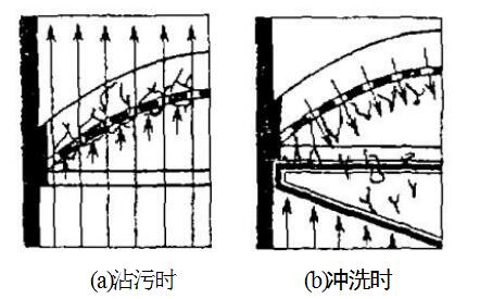 當濾網(wǎng)表面壓降超過允許值時,差壓計10便發(fā)出信號,將電動機4投運,排污閥8同時自動開啟。當旋轉(zhuǎn)水室3依次與各個扇形隔艙重合時,在所產(chǎn)生294~490kPa壓降的作用下,污穢物便隨同水流由閉合空間(見圖9)經(jīng)排污管排入冷卻水出水管。當排污閥8自動開啟時,穿過網(wǎng)孔的反沖水流速可達1m/s。濾網(wǎng)隔艙的沖洗如圖8所示,圖8中編號的代表說明和圖7相同。經(jīng)驗表明,即使穿入幾個網(wǎng)孔的細長水草,雖然它們牢牢地交織在一起,也很容易被沖掉,見圖9。