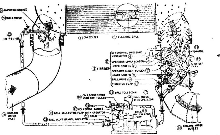 凝汽器海綿膠球清洗系統(tǒng)效果說(shuō)明及海綿膠球、冷卻水二次濾網(wǎng)選用,凝汽器海綿球連續(xù)清洗系統(tǒng)如圖1所示。它既用于循環(huán)供水方式,于冷卻水為淡水或海水的直流供水方式。