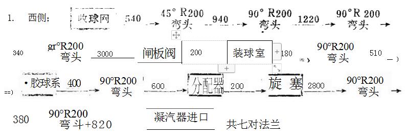 Q-容積流量,米°/時;C一流速,米/秒;d內(nèi)一管內(nèi)徑,毫米。能量方程h阻力=≥h沿程+≥h局部沿程阻力損失和局部阻力損失的計算公式下面的計算中,用的公式、系數(shù)和圖表,請參考“膠球清洗凝汽器設(shè)計導則”,其來源部分參考了吉林電力學院1975年編“熱機原理”二分冊六一八章。4機清洗裝置系統(tǒng)由于布置上的困難(通遼廠主機布置在5.5米平臺)被迫把裝球室、膠球輸送泵、分配器等布置在凝汽器的“背側(cè)”(即和循環(huán)水進出口水室相對的另一側(cè))。這擇一來管道長度就大為增加,使得水阻增加,距操作人員也稍遠。進行水力計算時由于缺少一些實測數(shù)據(jù),只得做一些簡化模型;1,把裝球室看作二個90°彎頭郁上一個突然擴大和突然縮小的通道來處理。2,把分配器看作60°彎頭。這樣做很可能不正確,有待今后用實驗求得。凝汽器兩半清洗管路系統(tǒng)基本尺寸如下(單位毫米):圖中→表示φ50鋼管,=>喪示φ75管。