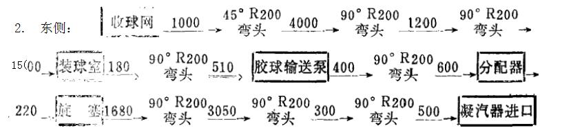 共八對法蘭收球網(wǎng)比凝汽器進口位置高(記為2):Z=870東側(cè)西側(cè) 45°彎頭 1個 1個 90°彎頭 7個 7個內(nèi)徑φ50管14450毫米1062)毫米 690毫米 內(nèi)徑φ75管 690毫米計算大致程序如下:先假定管路系統(tǒng)流量為Q,①查膠球泵H—Q曲線,查出揚程H②從Q:算出水流速C,以便算出沿程阻力和局部阻力。進而求得總水阻h總。(它應(yīng)等于凝汽器水阻+管路水阻)③考慮收球網(wǎng)和凝汽器高差Z,若H+Z=h總則假定的Q?是正確的;否則另假定新的流量Q?重復(fù)上述計算,直到H+Z=h總時為止。
