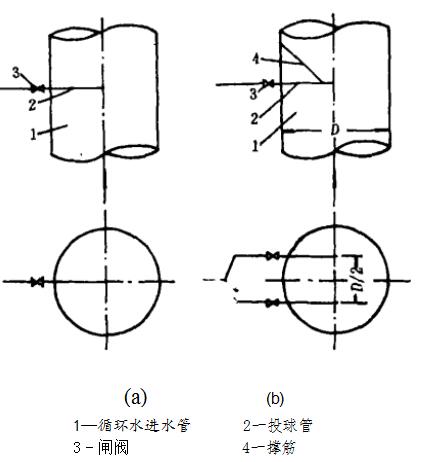 應(yīng)短直、流暢、變頭圓滑,以盡量減小系統(tǒng)阻力損失,便于海綿膠球進(jìn)入循環(huán)水管并與循環(huán)水均勻混合。