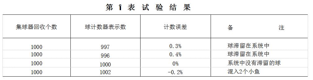 試驗(yàn)結(jié)果如表1所示,大計(jì)數(shù)誤差為0.4%。其原因是由于試驗(yàn)系統(tǒng)結(jié)構(gòu)上的問(wèn)題在運(yùn)行過(guò)程中有幾個(gè)球停滯在集球器和配管中沒(méi)有經(jīng)過(guò)球計(jì)數(shù)器,有的是由于混入了小魚(yú)造成的。在沒(méi)有其他原因的情況下,球計(jì)數(shù)器的計(jì)數(shù)精度達(dá)到了100%。
