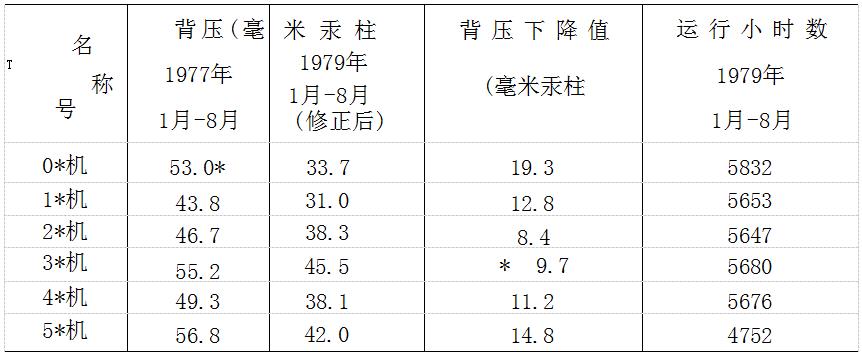 采用膠球清洗裝置后,汽輪機(jī)背壓下降(見表2)。為能進(jìn)行統(tǒng)一比較,以1977年數(shù)據(jù)為標(biāo)準(zhǔn),根據(jù)負(fù)荷、江水溫度對(duì)1979年的汽輪機(jī)背壓進(jìn)行修正。