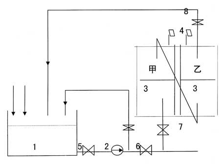 1-溶液箱 2-循環(huán)泵(5千瓦,流量30立方/小時,DN50管絲扣連接) 3-凝汽器 4-水側(cè)頂部排氣門 5-8隔離閥門 甲乙A/B側(cè)回水室