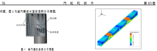 在傳統(tǒng)凝汽器水室內(nèi)部產(chǎn)生了大量旋渦,這些旋渦主要分布在進(jìn)口水室的上部和下部,這些旋渦區(qū)域速度很低,不利于膠球進(jìn)入凝汽器冷卻管。目前電廠所使用膠球的濕態(tài)密度跟冷卻水基本一致,因此,在實(shí)際運(yùn)行中,膠球會(huì)跟隨冷卻水在水室的上部和下部旋轉(zhuǎn)、停留,導(dǎo)致膠球不能夠及時(shí)進(jìn)入到冷卻管道,甚至聚集在水室內(nèi)部,進(jìn)一步導(dǎo)致傳統(tǒng)凝汽器膠球清洗裝置系統(tǒng)的清洗效果下降。