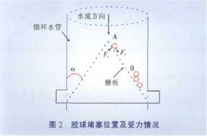 發(fā)電廠機(jī)組膠球清洗系統(tǒng)投運(yùn)后,膠球不能有效進(jìn)行循環(huán),許多膠球都堵塞在收球網(wǎng)的膠球出口B點(diǎn)處刊見(jiàn)圖2)。前面膠球阻止后面膠球流動(dòng),導(dǎo)致大量膠球卡澀在收球網(wǎng)上,不能循環(huán)清洗凝汽器銅管,導(dǎo)致銅管結(jié)垢加速,換熱效率顯著降低。