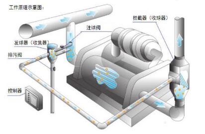 球發(fā)射器(發(fā)球器/收集器)將膠球發(fā)送入冷凝器中,膠球依靠冷卻水的高流速擦洗掉冷凝器換熱銅管內(nèi)壁上的污垢,在冷卻水出水口端通過球回收器(捕球器/攔截器)回收膠球至發(fā)球球體收集器形成一個清洗循環(huán),通過PLC控制系統(tǒng)設(shè)置清洗頻率,達(dá)到自動在線清洗功能。始終保持冷凝器內(nèi)壁潔凈,換熱效率高,冷水機(jī)組制冷效率高,克服由于污垢的產(chǎn)生而引起冷水主機(jī)制冷效率下降,從而降低能耗,節(jié)省能源。