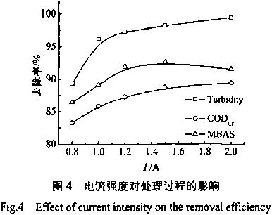 洗衣廢水濁度、COD和MBAS的去除率與電流強(qiáng)度的關(guān)系如用4所示。隨著電流強(qiáng)度的提高,這幾種指標(biāo)的去除率逐漸增加。